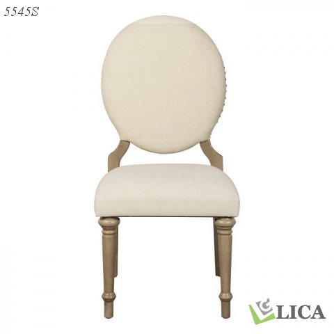 The intersection of traditional formality and casual elegance is perfectly captured in the design of the Avignon Collection. The round-back side chairs feature natural toned fabric. Dark nailhead defines the chair profiles while also providing contrast to the light fabric.