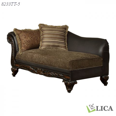 Classically styled for the most traditional of homes, the Thibodaux Collection will complete the vision you have for your elegant living room. Offered in brown fabric with faux leather accent, the chaise combines these covers with a dramatic show wood frame that features carvings and scrolled arms. Contrast toss pillows complete the look.