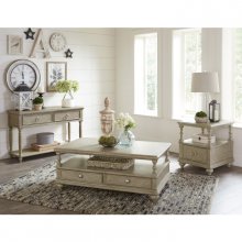 The graceful lines of the Grayling Downs Collection are a welcoming addition to your living room. Styled in the modern-traditional aesthetic, subtle accenting lends elegant touch to the design of the sofa table. A driftwood gray finish enhances the acacia solids and ash veneer, providing a neutral platform for your decorative preferences. Traditional design elements include – open display shelving, brushed nickel knob and ring pulls, turned feet and decorative pilasters.
