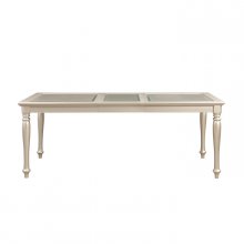 The look of traditional design is updated for the modern traditional home in the Celandine Collection. The table leg of the collection stands proudly as the main platform of your formal dining room. Crystal tufting immediately draws the eyes to the subtle pearlized finish of the faux leather chair backs, while high polished knob hardware stands out from the silver finish of the server. Inset glass highlights the shagreen embossing accent of the table’s top and server top. The server features shagreen drawer fronts, built-in wine rack, drawer and behind door storage. With each of the aforementioned elements, subtle glamour will be achieved in the design of your elegant dining room.