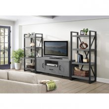 Gunmetal finish provides distinct contrast to printed gray wood grain melamine veneer in the Dogue collection. The 63-inch TV stand features open display shelving and door storage. 76-inch TV stand, 4-shelf bookcase, slide-in cabinet and baskets are also available.