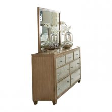 Your personal style will be reflected with the addition of the Kalette Collection to your bedroom. Antiqued mirror panels cover the drawer fronts of dresser, highlighting the light oak finish over oak veneer of the collection. Knob hardware provides an unobtrusive break to the clean lines.