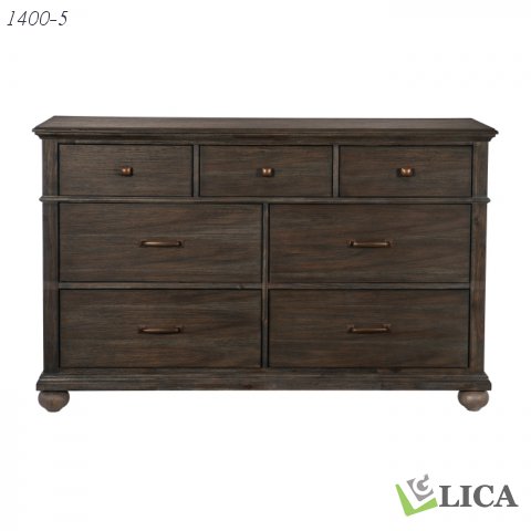 Classic accenting is paired with rusticated styling to create the look of the Motsinger Collection. Solid acacia and acacia veneers are finished in a wire-brushed rustic brown, perfectly accenting the wood’s distinct grain. Bun feet provide support to the dresser while knob and bar hardware front the drawers of the piece.