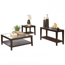 Glass overlays the intricate, staggered pattern, acacia wood blocks of the Vincent Collection. The intricate pattern surrounds a center contrasting block. This unique sofa table features display shelves and a modern two-toned natural acacia and espresso finish, with glass insert table top. Cocktail table and end table are also available.