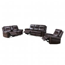 Stylish appeal combines with contemporary comfort to bring you the Emerson sofa collection. Generously stuffed with plump back cushions to offer all the lumbar support you could want, this handsome collection is upholstered in supple brown leather gel, presenting your living room with a luxurious look and feel. Double tab-pull latches give you the option to stretch out and recline at either end, and combined with coil seat construction padded with high density foam, you may never want to get up again. The loveseat's central console features lift-top storage and metal cupholders for additional convenience. Eye catching details such as double stitch patterning and brass nailhead trim along the armrests ensures the Emerson is not only functional but retains its status as a handsome anchor for your contemporary living room décor. Also available in black leather gel.