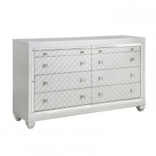 The bold visual presentation of the Leesa Collection complements your glamorous design aspirations. Diamond pattern drawer fronts and hardware, and mirrored framing are featured on the silver-finished dresser, it’s classic styling lending timeless accent to the look of the collection.