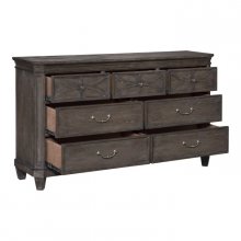 The transitional style of the Sandpoint Collection utilizes classic design elements to create a unique selection for your bedroom. Distinct framing defines the drawer fronts of the dresser. Decorative accent graces the top drawers, while cantered pilasters lend to the classic style. The distinct grain of oak veneer and solids is highlighted by gray finish. Antiqued brass finished drop pull and knob hardware complement the collection’s finish.