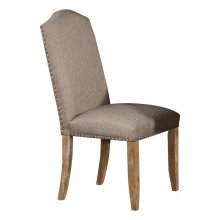 Designed for your casual dining space is the Jemez Collection. The substantial V-profile of the table base rises to support the faux marble top in this transitionally styled dining group. Brown fabric upholstered seats feature nail head accent and provide complementing contrast to the weathered wood finish of the chair legs and table base.