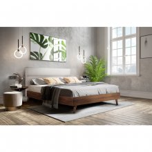 A study in contrasts, the Radcliffe Queen Bed not only combines elements of dark and light but also fabric and wood, all with great impact. A padded upholstered headboard in light beige fabric looks bright and fresh abutting against the richer brown of the footboard. The headboard’s softly textured linen highlights the distinct graining of the bedframe’s faux walnut finish. Exposed angled legs support a low profile platform design that saves you the trouble of using a box-spring or foundation. Elegant in its simplicity, the Radcliffe’s array of neutral hues and textures is at home in any contemporary bedroom.