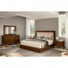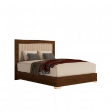 Combining the best of old world textures with new world styling, the Eva Collection is a feast for the senses. Impeccable Italian craftsmanship is on full display with this Queen Bed's luxurious detailing, exemplified by a deep faux walnut finish that is further enhanced by a protective acrylic lacquer. The lacquer coating not only imparts a lustrous glow to the faux wood but also makes it impervious to stains, scratches, and heat. The modern minimalist profile is elevated further by a thin line of brushed gold trim along the headboard, outlining the plush beige velvet upholstery with its delicate vertical channel tufting and highlighting how the Eva's effortless elegance reinforces the decadence of its design.