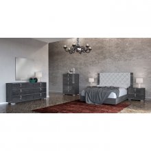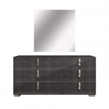 Behold the epitome of Italian craftsmanship and design with the sophisticated Sarah Ala Mode Collection. Gorgeously detailed, this opulent dresser showcases splendid grey faux birch wood grain beneath a high gloss acrylic lacquer for a finish that is both lustrous and exceptionally durable. Contemporary curved chrome-finished metal vertical accent hardware adds a touch of metallic contrast while presenting a modern façade. Sitting atop matching chrome legs, this sleek design is complete with six ample drawers that close gently and silently thanks to an ingenious soft-closing mechanism. Fusing luxury and modernity, the Sarah Ala Mode transforms your bedroom into a realm of refined elegance.