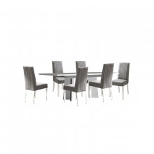 Effortless style with luxurious detailing defines the Mara 7-piece dining set. Designed and produced with signature Italian flair, this exquisite collection boasts a pristine white lacquer appearance with an acrylic finish that is both radiant and highly resilient. The table's spacious top is graced with grey faux Carrera marble inlay for a truly timeless elegance, supported by a contemporary geometric double pedestal base with chrome accenting that creates a dramatic yet minimalist silhouette. Space for your guests is always assured thanks to a separate extension leaf that is cleverly stored inside the table, so it is ready whenever you need it. Coordinating side chairs feature solid padded back and seat cushions with velvety soft grey microfiber upholstery, accented by vertical channeling for some understated flair. Elegant but never exaggerated, let the Mara give your dining room the style it deserves.