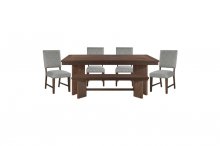 Modern lines pair with subtle rustic influence to create the design of the Franco Collection. The prominent grain of the collection’s walnut veneer is highlighted by a walnut finish. The angular lines of the trestle table base provide ample support for the table’s rectangular top. The available side chair’s seat and back is covered in gray textured fabric upholstery. The wood-topped bench’s design features a trestle design with v-angled pedestals providing stylish support. The server has behind door cabinets, and drawers that allow for storage of your tabletop accessories and feature antique nickel tone bar hardware.