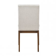 The Maude Collection’s transitional style is scaled for your home’s casual dining space. The collection’s birch veneer features a chestnut finish, the classic hue highlighting the distinct wood grain. Coordinating wood-framed side chairs flank the table, their seats and channel-stitched backs covered in beige textured fabric upholstery.