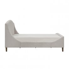 With its sumptuous curves and contemporary profile, the Sabrina Collection’s appeal for your modern bedroom is unmatched. Fully padded and upholstered in a marvelously soft textured chenille fabric, this King Bed creates a dreamy and restful atmosphere with elegant lines that invoke a French-style chaise, but with the coziness amped up thanks to the headboard’s arched shelter design combined with the tall shelter footboard. A light beige palette provides a neutral canvas for building the rest of your bedroom; it can ground vibrant décor choices or serve as the cornerstone to a light and tranquil environment. Resting atop exposed wooden legs in a brown wood finish, this low profile bed is blessed with a platform design so you can take box-springs or foundations out of the equation and lay the mattress directly on the slats. Beautifully crafted but elegantly unfettered, the Sabrina transforms your sleeping space into a sophisticated bedroom with ease.