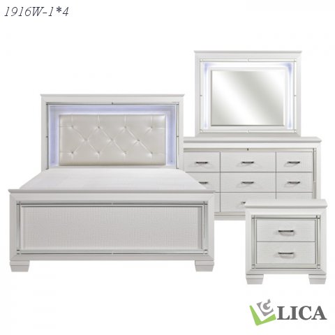 Glamour reigns in the design of the Allura Collection. Framing each piece is a decorative beveled mirror accent that enhances the illumination from the touch-engaged LED backlight of the headboard and mirror, as well as the under-light of the night stand. Alligator embossing and high polished crystal-enhanced hardware boldly accent the white finish as does the pearl-white faux leather crystal-tufted headboard insert of the collection.