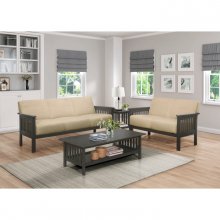 Designed with inspiration from the Arts & Crafts movement, the Lewiston Collection will be a classic addition to your home’s décor. The love seat's transitionally styled legs and vertical slat-supported wood arms are finished in an antique gray, providing complementing contrast to the brown linen-like fabric covering.